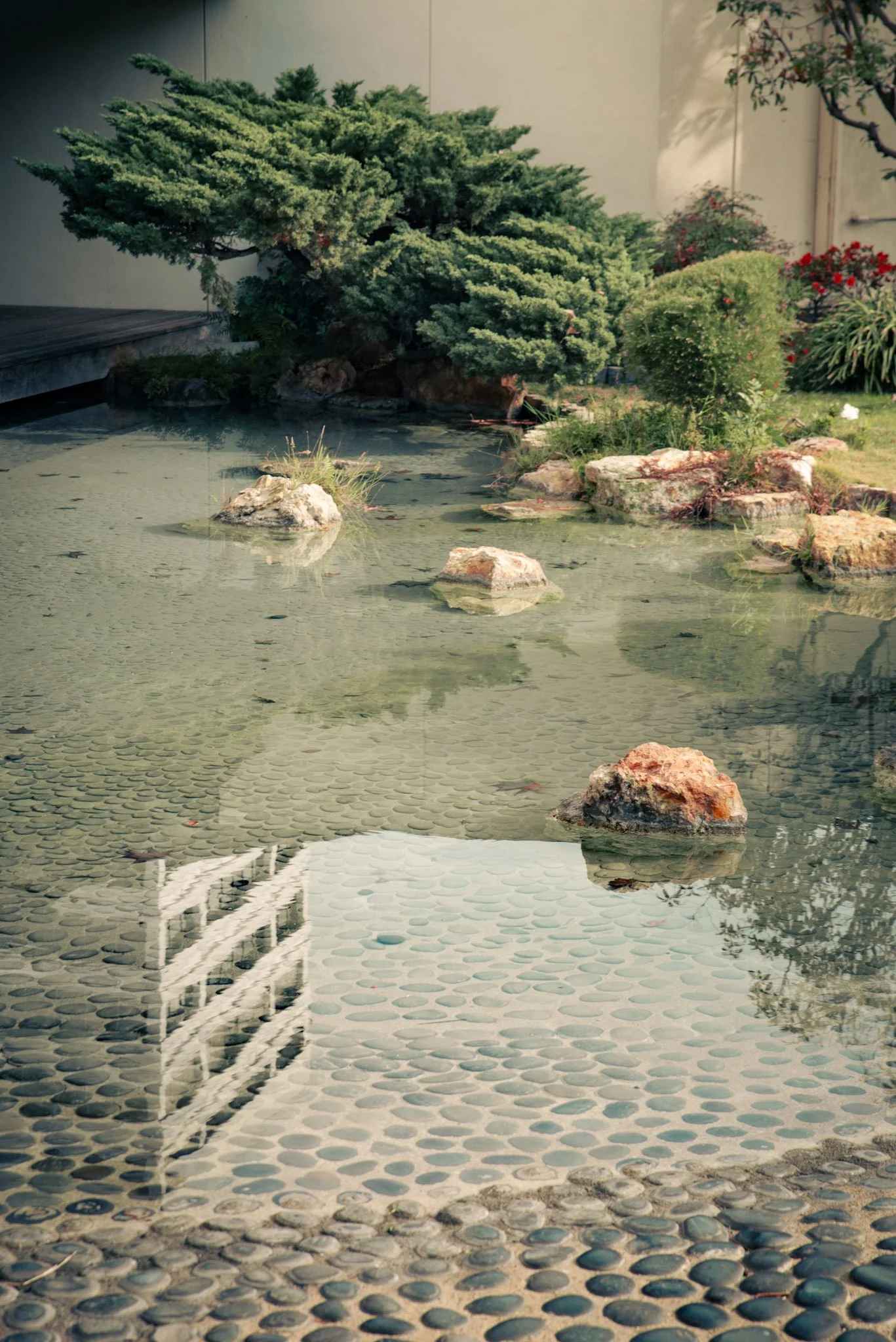 Even though the garden is compact, it’s one of my favorite places to photograph in Los Angeles. It’s surprisingly quiet and often empty, making it easy to take your time and explore. Every few steps offer something new: shifting light, reflections in the water, and shadows across the stonework, buildings, and other structures. Because the space is so dense, you can find multiple compositions without moving more than a few feet.